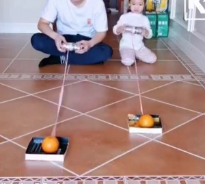 Juego 2: para este juego necesitaremos la tapa de alguna caja, algo de peso para meter dentro (pelota de tenis, mandarina…), una botella de plástico y una cuerda. Consistirá en atar la cuerda la caja o pegarla y dejar como 2m de largo y enrollarla en la botella de tal manera que al ir enrollando la cuerda en la botella la caja con el peso avanzará, ganará el que consiga acercarla a sí mismo antes.