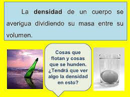 La densidad de un cuerpo se obtiene dividiendo su masa entre su volumen. La unidad de medida de la densidad es el gramo por centímetro cúbico (g/cm3). Un cuerpo flota en el agua si su densidad es menor que la de esta (1 g/cm3).