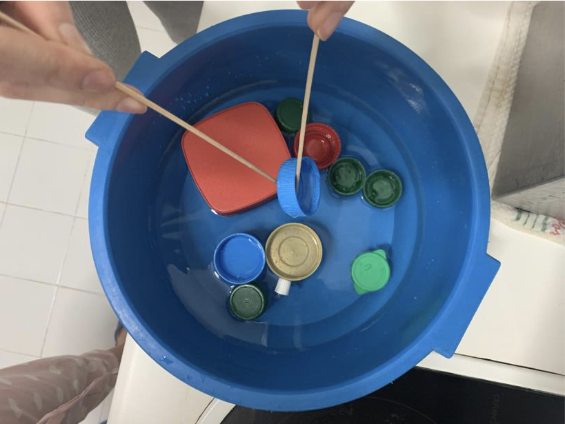 VAMOS A PESCAR TAPONES, BASTA CON LLENAR UN BARREÑO CON AGUA E INTRODUCIR VARIOS TAPONES RECICLADOS, Y UTILIZANDO DOS PAJITAS O PALITOS INTENTAR PESCAR ESOS TAPONES.
