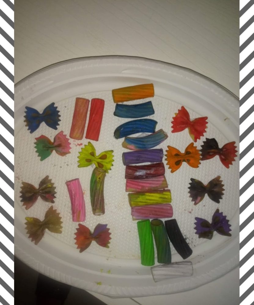 Vamos a necesitar macarrones gordos o como los tengáis en casa,pajaritas ,o lo que mas os guste de pasta ,acuarelas ,pegamento y un platito de plástico o cartón ,Empezamos a colorear los macarrones de diferentes colores y los déjanos secar ,y luego lo pegamos de la manera más divertida o bonita que os apetezca ,dejarlo esperar un rato.