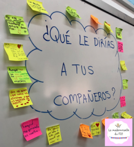 En el centro, escribís, ¿Qué le diría a mis compañer@s? Y cada día, si os surgen pensamientos y necesidad de hablar con ell@s y decirles cosas, lo vais escribiendo en esas hojas, o pegando en post-it si tuvieráis.
