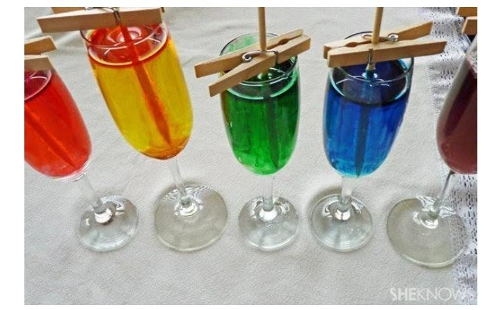 Sirve el jarabe de azúcar en los vasos y agrega el colorante. Después, introduce los palitos evitando que toquen las paredes del recipiente. Ayúdate de unas pinzas para la ropa. Después, espera tranquilo hasta que el azúcar se cristalice formato un palito de caramelo del color del colorante.