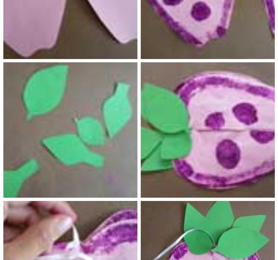 • Ahora dobla cada mitad de la fresa a lo largo y haz un corte por la línea del doblez: en una mitad desde arriba hasta el centro y en la otra desde abajo hasta el centro. Ahora, encaja las dos mitades y pega las hojas en la parte superior del móvil.