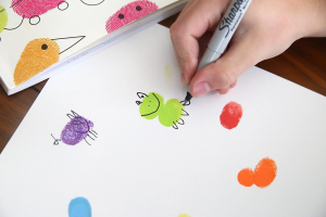 Una actividad con mucha imaginación sobre todo para los mas pequeños de casa, ya que su imaginación no tiene limite. Y que mejor que dibujar animales, monstruos, lo que se les ocurra en una pequeña mancha hecha de sus huellas. A partir de dibujar, se divertirán pintando con las manos, y que su imaginación vuele! Un ejemple de lo que pueden dibujar seria algo así: