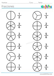 Hoy vamos a trabajar las fracciones, vamos a empezar por colorear la parte que creáis de cada fracción en su dibujo correspondiente. Os daré una pista yo la primera fracción la leería…1 de 2.
