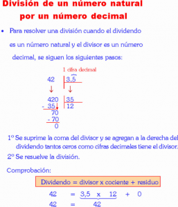 Para dividir un número natural entre un número decimal, se multiplican ambos por la unidad seguida de tantos ceros como cifras decimales tenga el divisor, y después se hace la división de números naturales obtenida.
