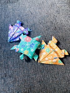 También os enseño mis creaciones de origami, una pequeña tortuga y dos ranitas saltarinas. Espero que os gusten J.