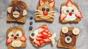 Coge la cantidad de rebanadas de pan que vas a querer. Unta la crema de cacao, de cacahuete o queso de untar, y después añade tu fruta favorita. Puedes hacer tus propios diseños, pero aquí tienes unos súper chulos. ¡Qué os aproveche!
