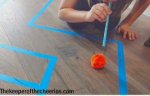 Sólo necesitas marcar en el suelo (limpio) un laberinto con cinta de aislar o hilo (para sujetarlo al suelo tendréis usar celo). No olvides que debe de tener un inicio y un final. Deberán llevar la pelota  hasta la meta sólo soplando usando la pajita o tu propio aire.