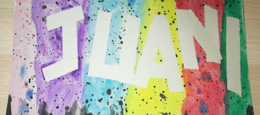 Crearemos nuestro nombre en un cartel, para ello vamos a necesitar… MATERIALES: Cartón o cartulina. Cinta adhesiva. Tijeras. Pinturas: acuarelas, temperas, rotuladores o lo que queráis. Pincel y bote con agua para enjuagar. REALIZACIÓN: Recortamos un rectángulo de cartón. Pegamos la cinta adhesiva formando nuestro nombre. Pintamos todo el cartel