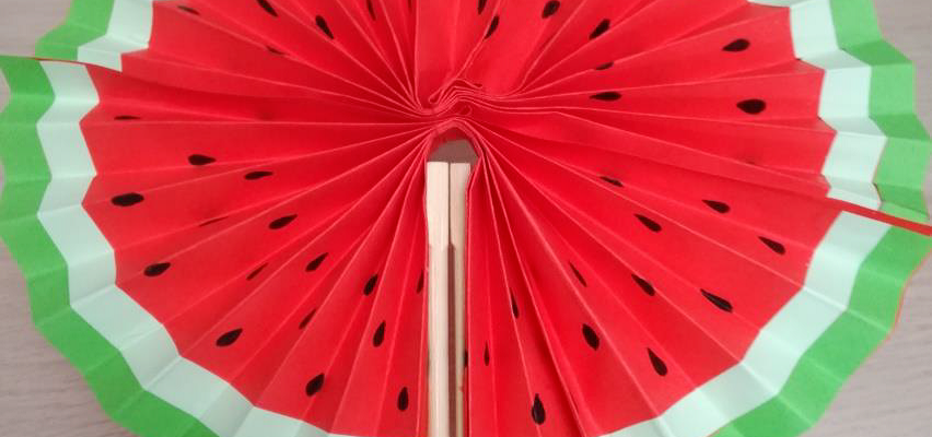 S va acercando el verano y que mejor idea que hacer nuestro propio abanico para refrescarnos los días calurosos. Mirad la elaboración y el resultado final en la foto después de que se secase bien. MATERIALES: – Folio rojo, verde oscuro y verde claro. – 2 palillos chinos de madera